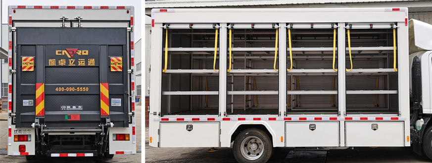 JDF5100XZBQ6型裝備車(chē)由底盤(pán)、液壓搭橋(尾)板、器材箱等組成,內(nèi)部設(shè)置隔間,可根據(jù)運(yùn)輸設(shè)備的外形尺寸及特點(diǎn)固定、安裝,用于后勤保障,向一線(xiàn)輸送特種裝備。該車(chē)系選用慶鈴汽車(chē)股份有限公司生產(chǎn)的QL1110ANKAY二類(lèi)汽車(chē)底盤(pán)改裝而成,原裝單排駕駛室,可載含駕駛員在內(nèi)的乘員3人,駕乘舒適輕便。該車(chē)用于消防救援隊(duì)裝備運(yùn)輸,兩側(cè)卷簾門(mén),車(chē)尾安裝搭橋板或1噸垂直升降液壓尾板,搭橋板主要用于機(jī)器人上下車(chē)廂;貨物可通過(guò)液壓圍板上下車(chē),內(nèi)部根據(jù)轉(zhuǎn)運(yùn)器材的結(jié)構(gòu)進(jìn)行鋁合金器材架的搭建,該車(chē)最大的特點(diǎn)是操控性好、維修簡(jiǎn)便,可廣泛應(yīng)用于應(yīng)急消防隊(duì)、公安、醫(yī)療衛(wèi)生、廠礦企業(yè)及社區(qū)、碼頭等場(chǎng)所。